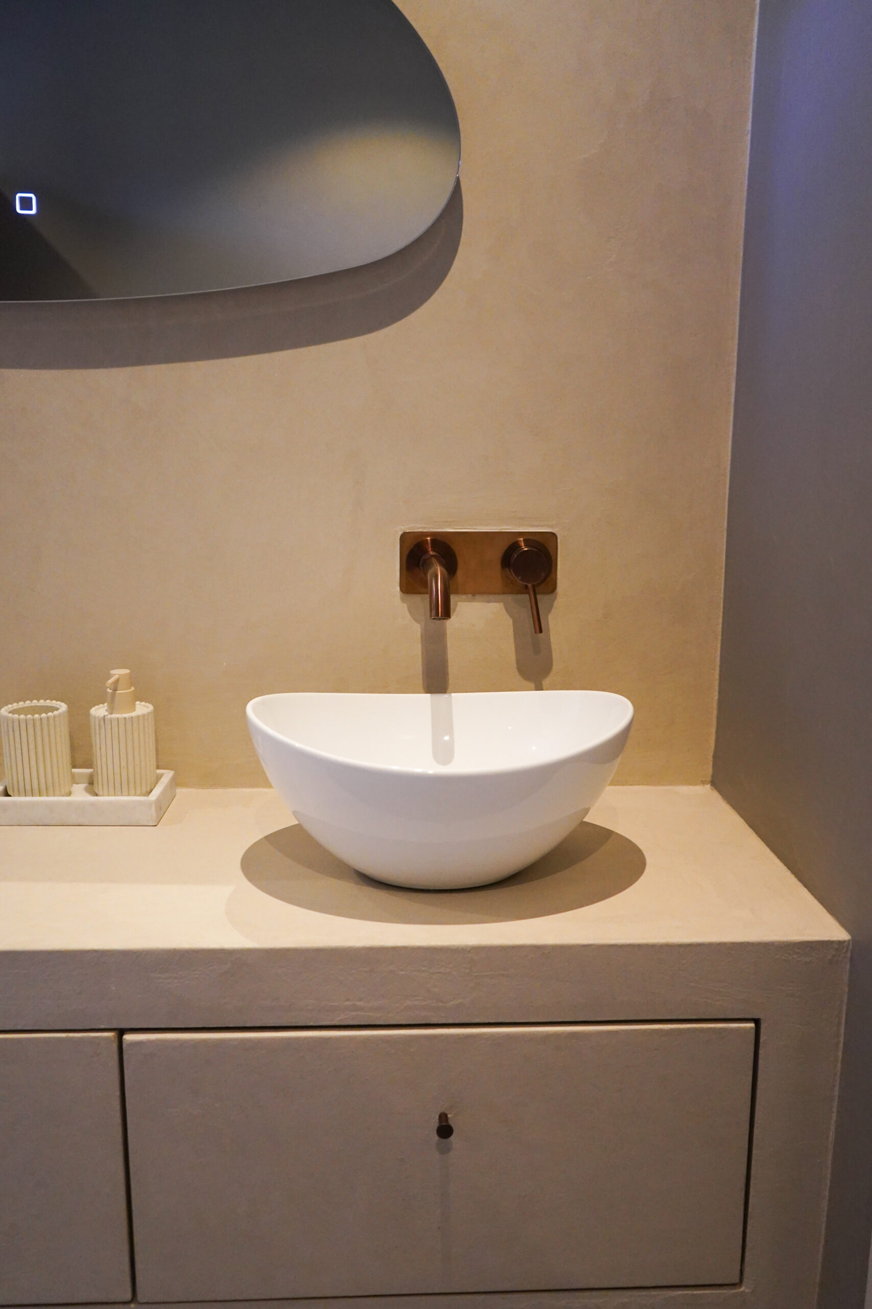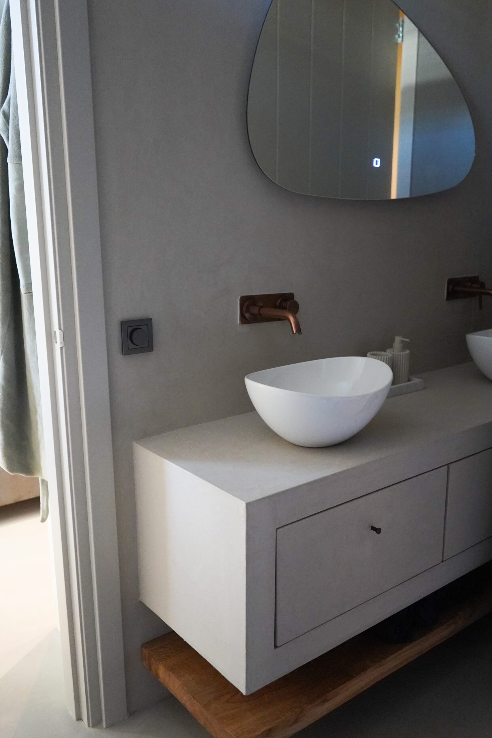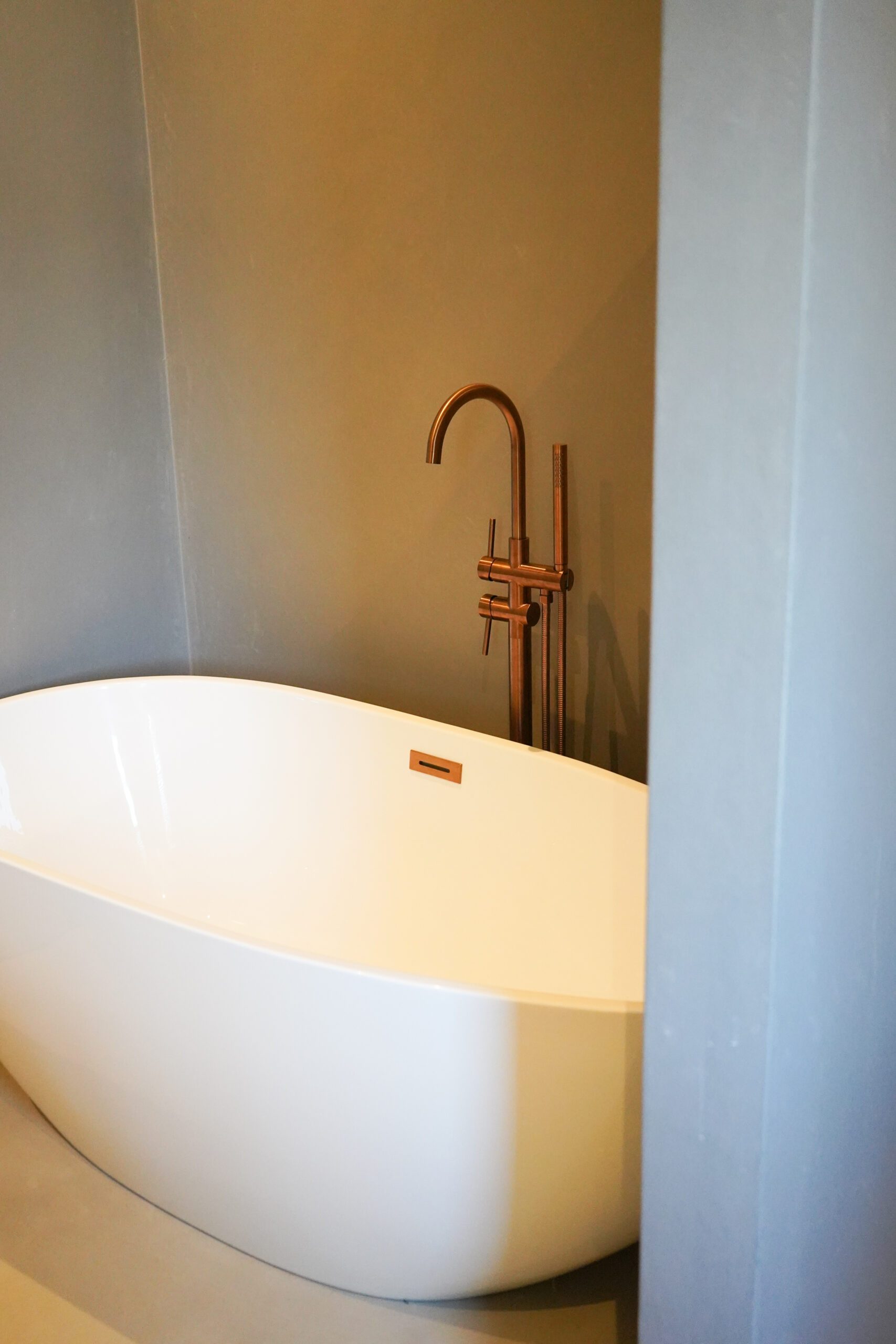 Het type microcement dat wij gebruiken is uitermate geschikt voor badkamers. Het toepassen van microcement in de badkamer biedt diverse voordelen. Zo is het materiaal volledig naadloos, waardoor er geen voegen aanwezig zijn. Dit maakt de badkamer schimmelvrij doordat onze epoxy waterdicht is en daardoor bovendien eenvoudig schoon te houden. Goed om te weten is dat wij over uw huidige tegels kunnen werken en deze tegels gewoon kunnen blijven zitten. Bekijk hier meer over badkamers.